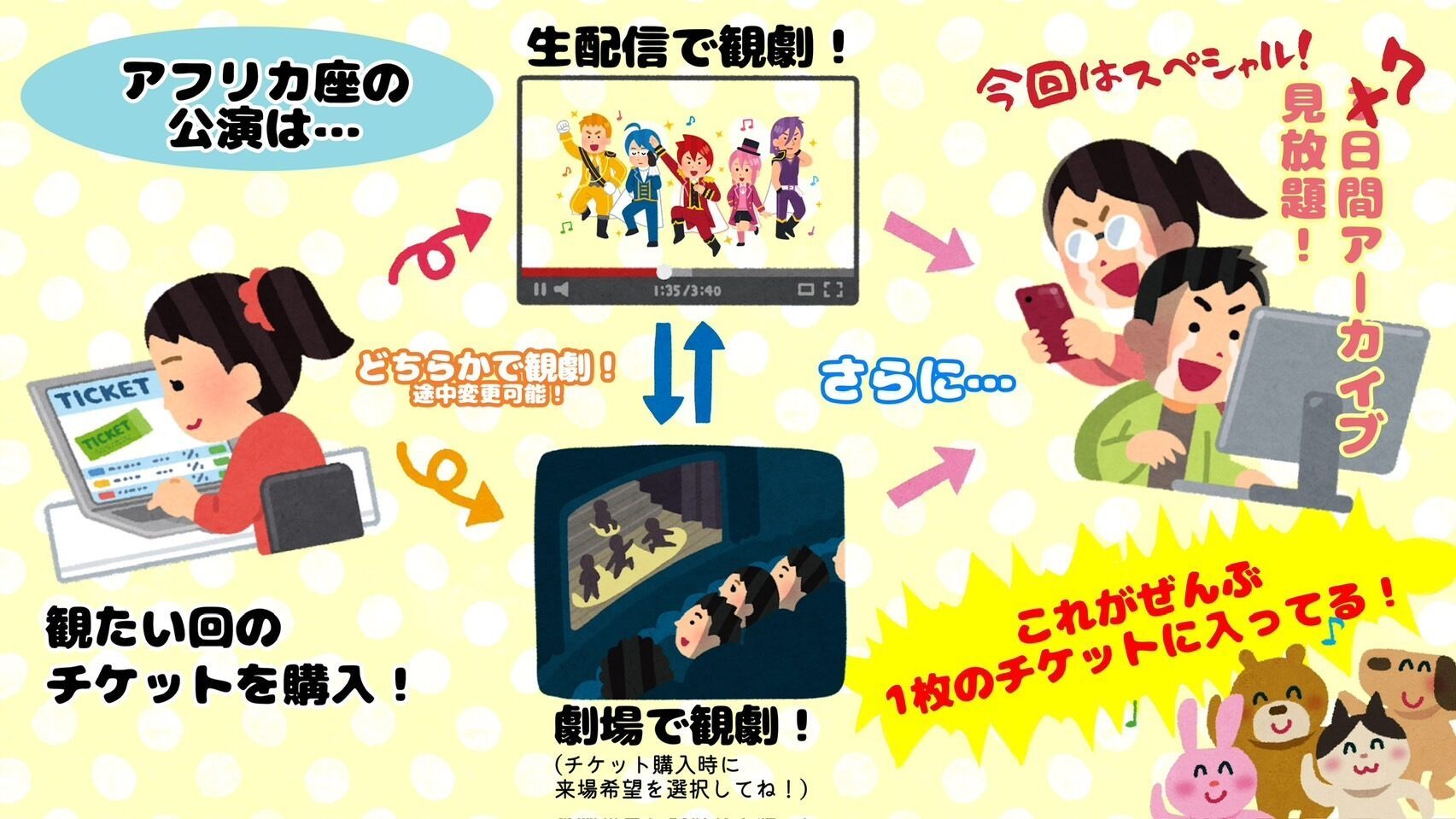 初日公演チケットに、アフリカ座PLUSの1ヶ月無料体験がついてきます。